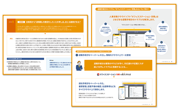 従業員が退職する際に企業がおこなう手続きは多岐にわたりますが、これら手続きは従業員の生活に関わるものが多いため、トラブルに発生しやすく、訴訟に発展するリスクもあります。そこで本資料では、退職に関する手続きでよく発生するトラブルと、その原因や対処法をまとめました。退職手続きのトラブル対策として、ぜひご活用ください。