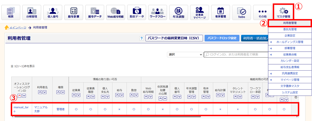 [マスタ管理](①)>[利用者管理](②)> 対象の利用者(③)をクリックします。