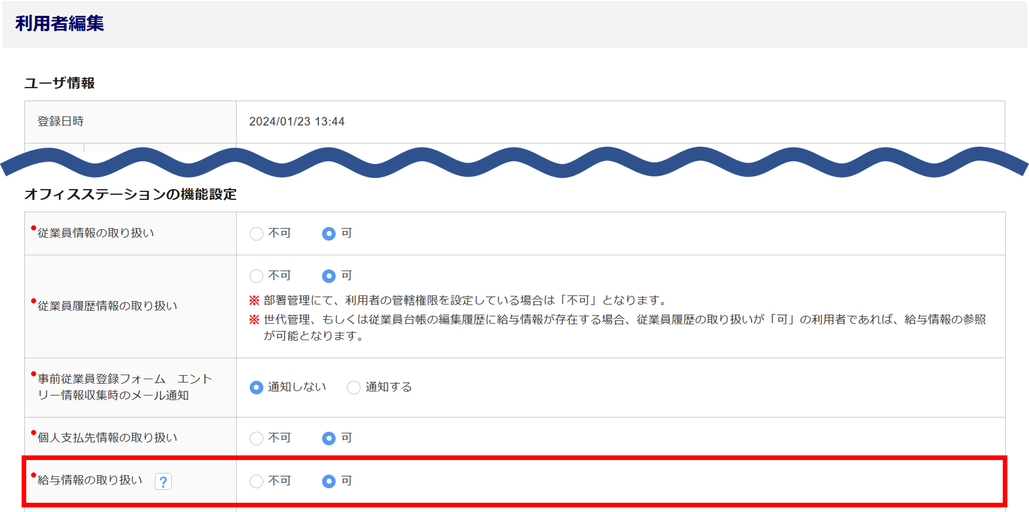 オフィスステーションの機能設定「給与情報の取り扱い」項目を「可」に変更し、画面最下部の[内容を確認する]>[保存する]をクリックします。