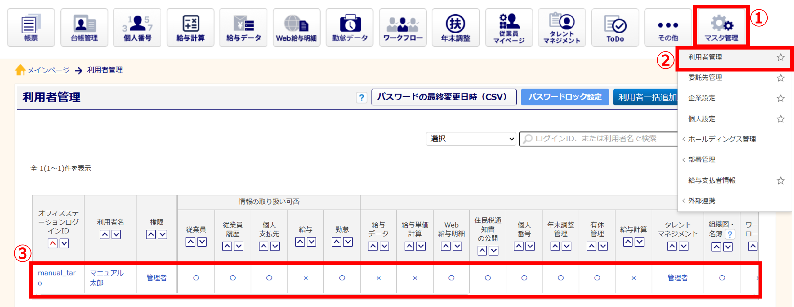 [マスタ管理]>[利用者管理]より「給与情報の取り扱い」権限を『可』に変更いただくか、マネーフォワード クラウド 給与にて連携設定時に入力した、ログインID情報をご変更ください。