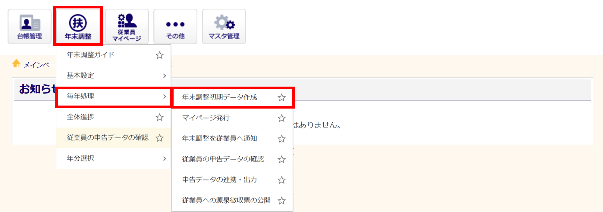 [年末調整]>[毎年処理]>[年末調整初期データ作成]をクリックします。