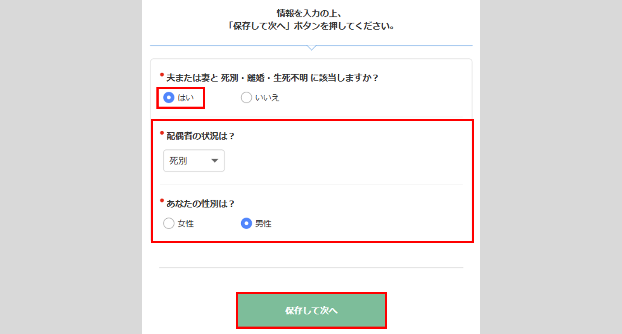 「配偶者の状況は?」と「あなたの性別は?」の項目が表示されますので、回答を選択します。