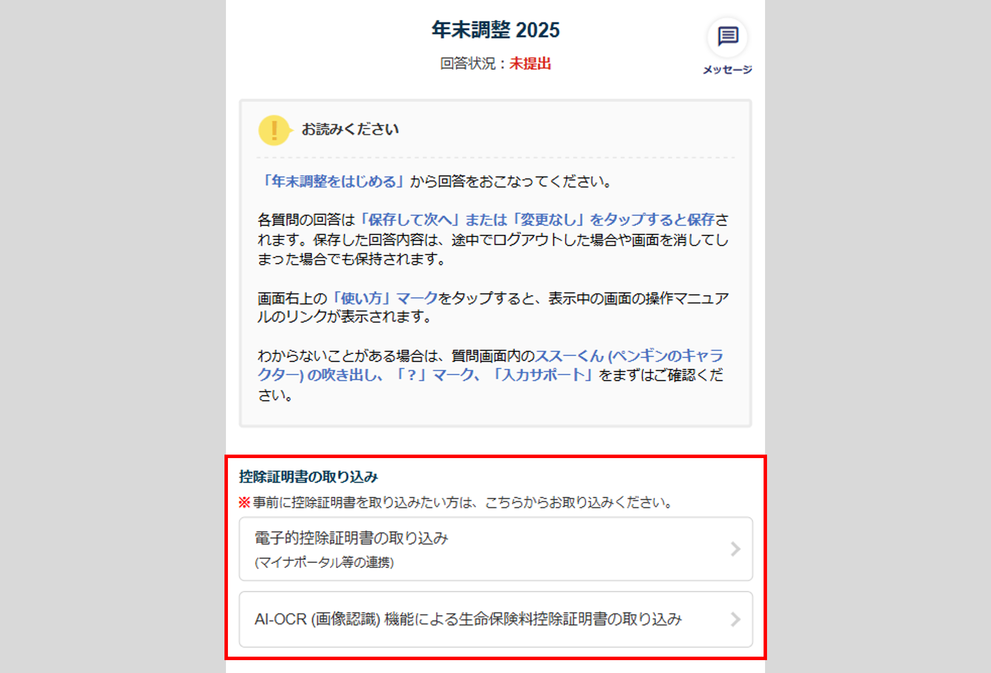 管理者側の設定により、「電子的控除証明書の取り込み」「AI-OCR(画像認識)による生命保険料控除証明書の取り込み」が表示されない場合があります。
