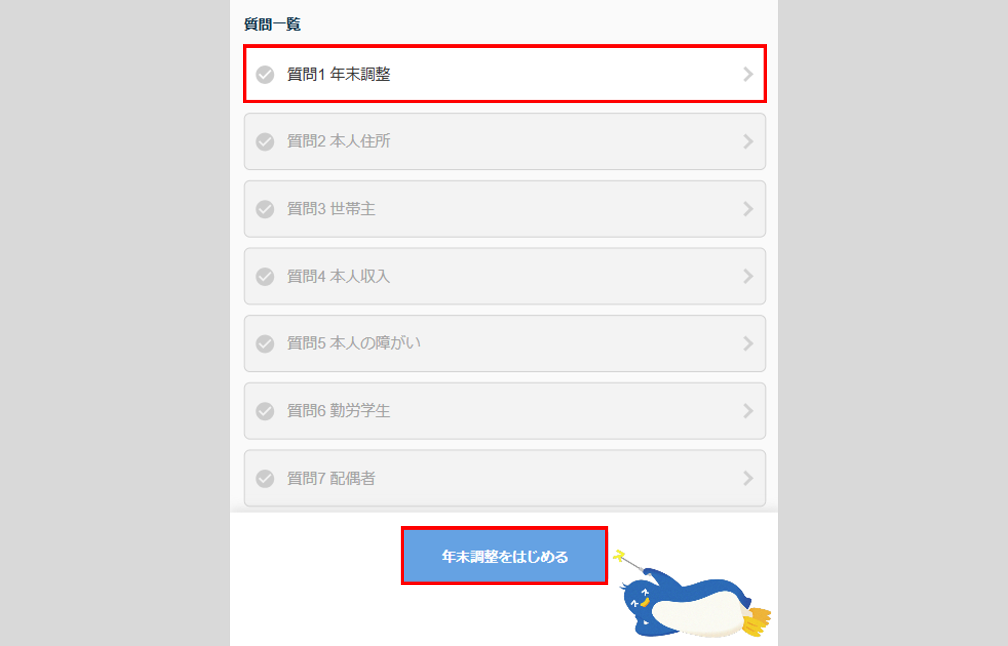 [質問1 年末調整]または、画面下部の[年末調整をはじめる]をクリックし、回答を開始します。