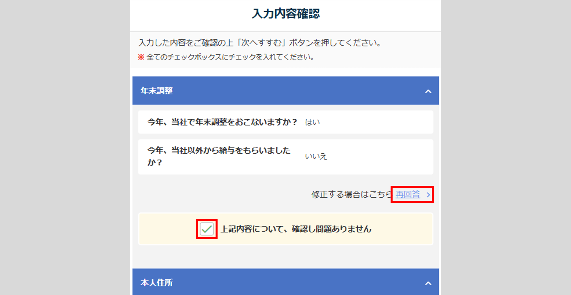 修正がある場合は、各項目内の[再回答]をクリックし、正しい内容に修正します。