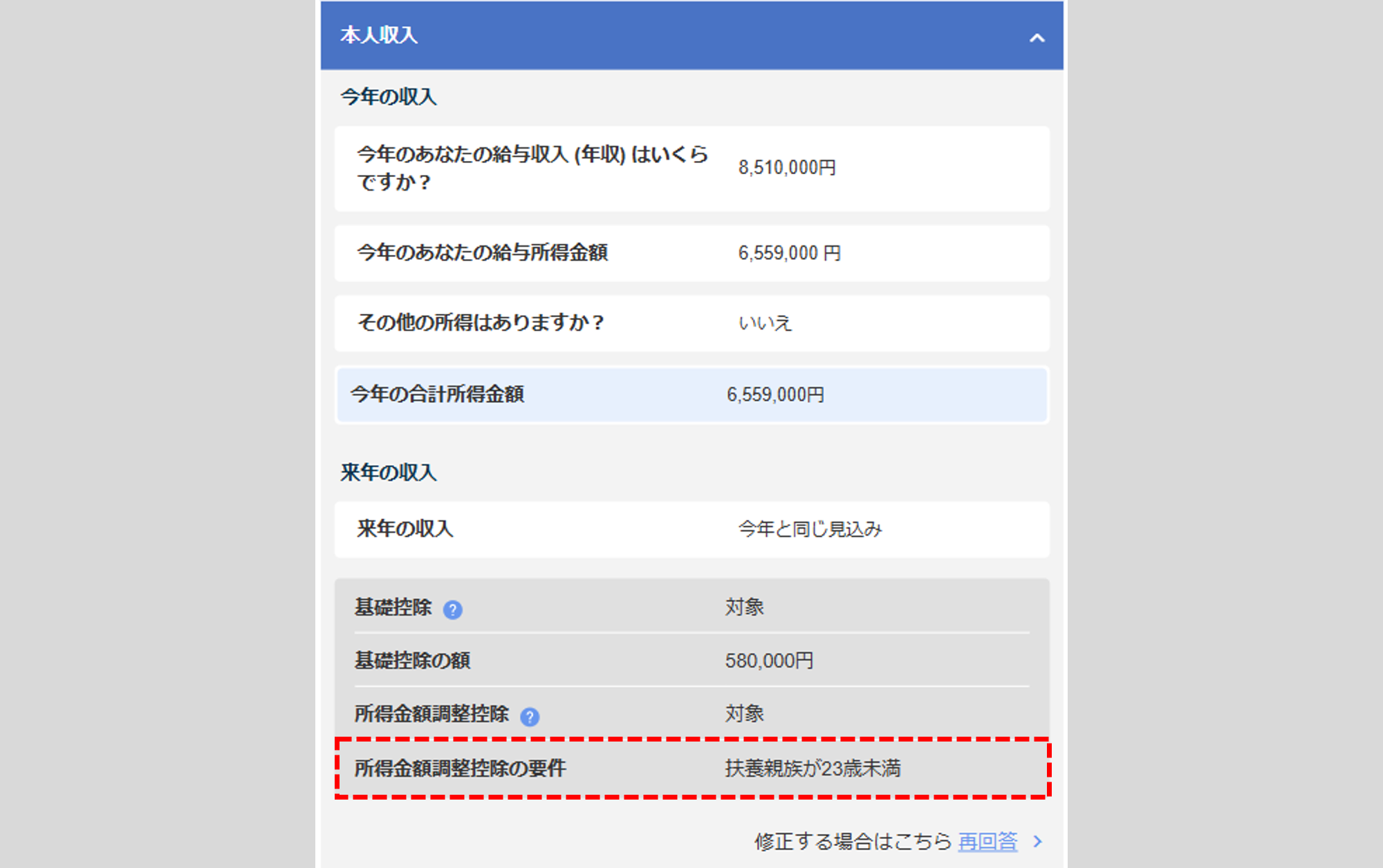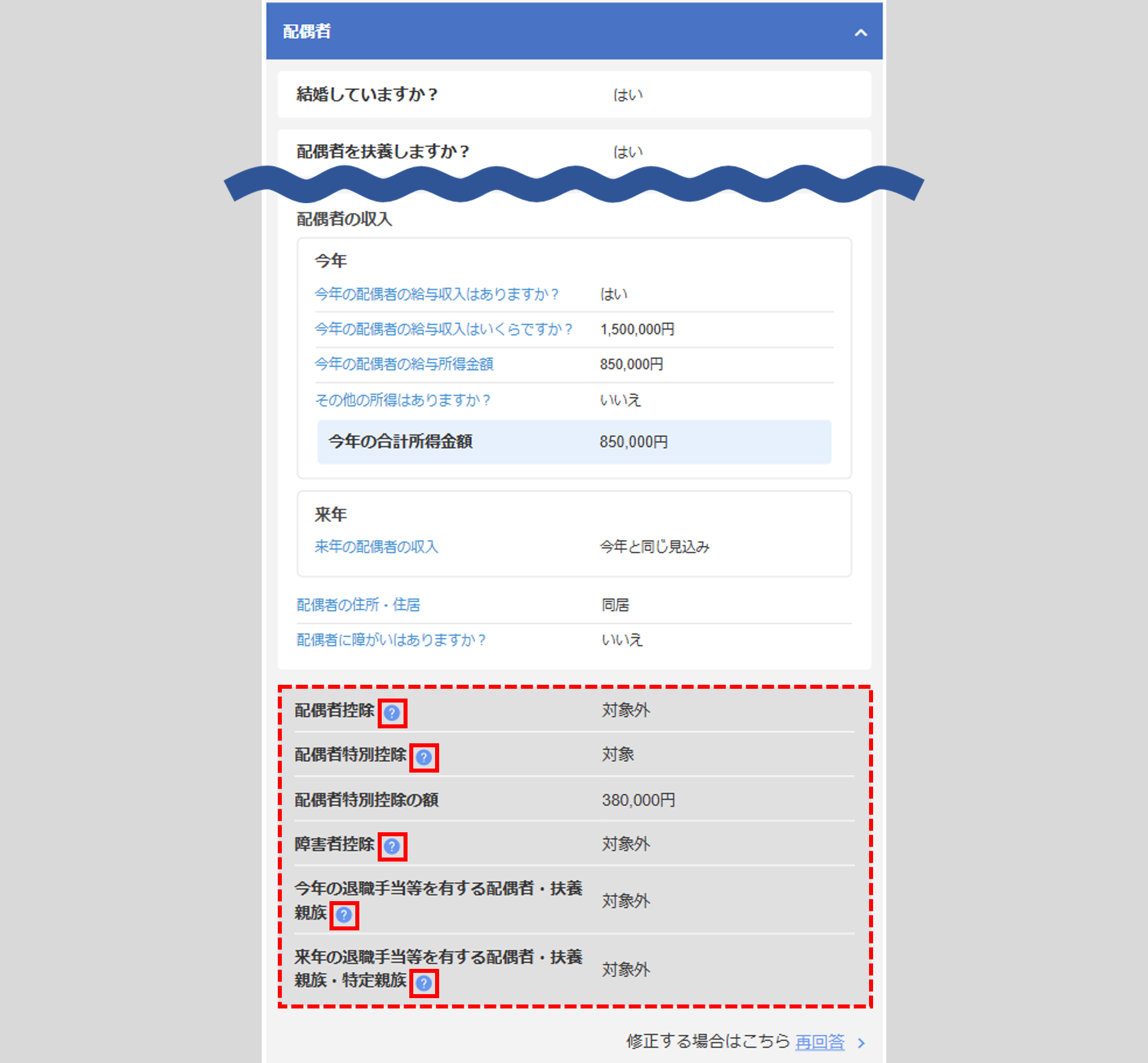 控除判定に関係する質問については、回答した内容に応じて控除判定が表示されます。