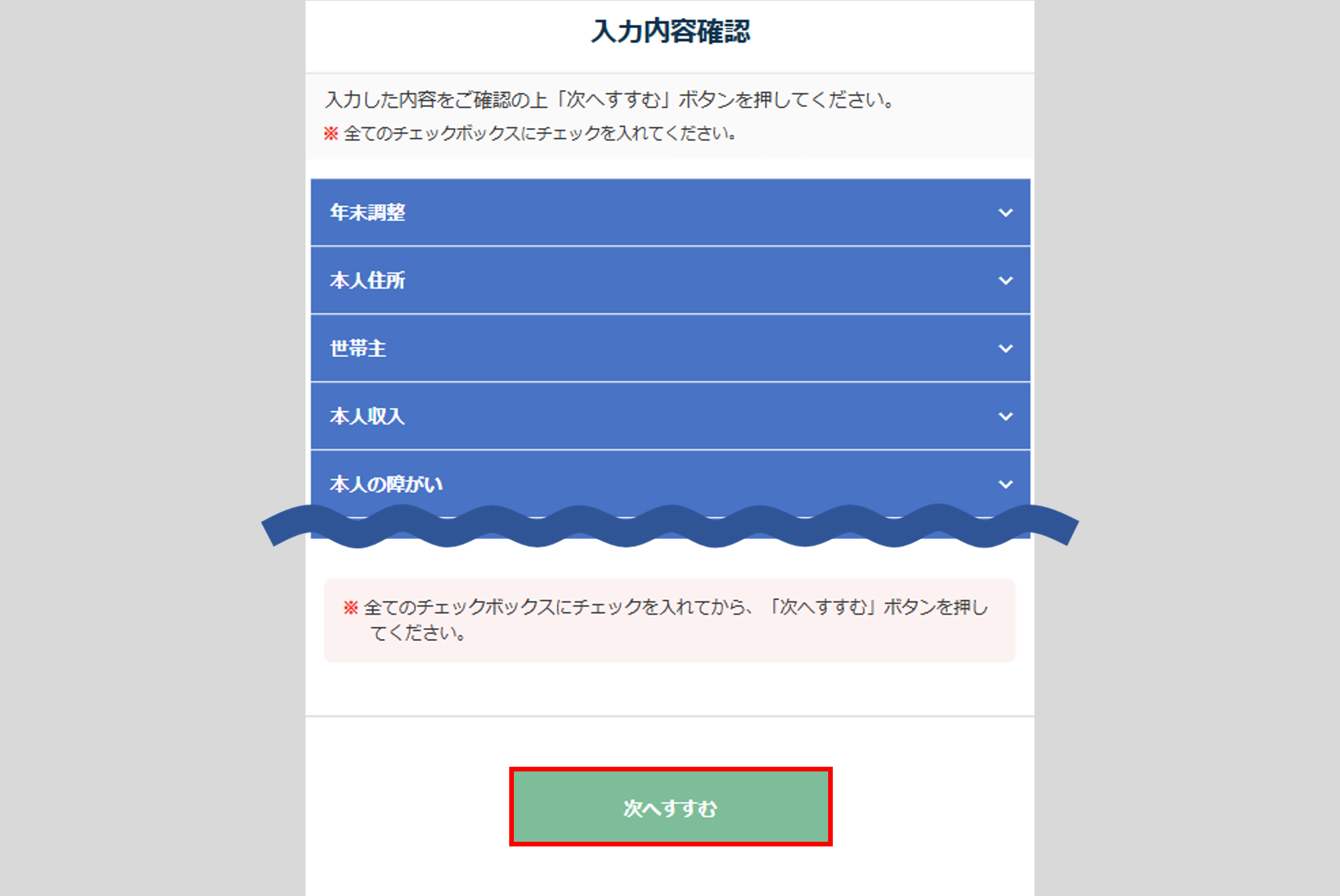 すべての項目を確認後、チェックをつけ[次へすすむ]をクリックします。