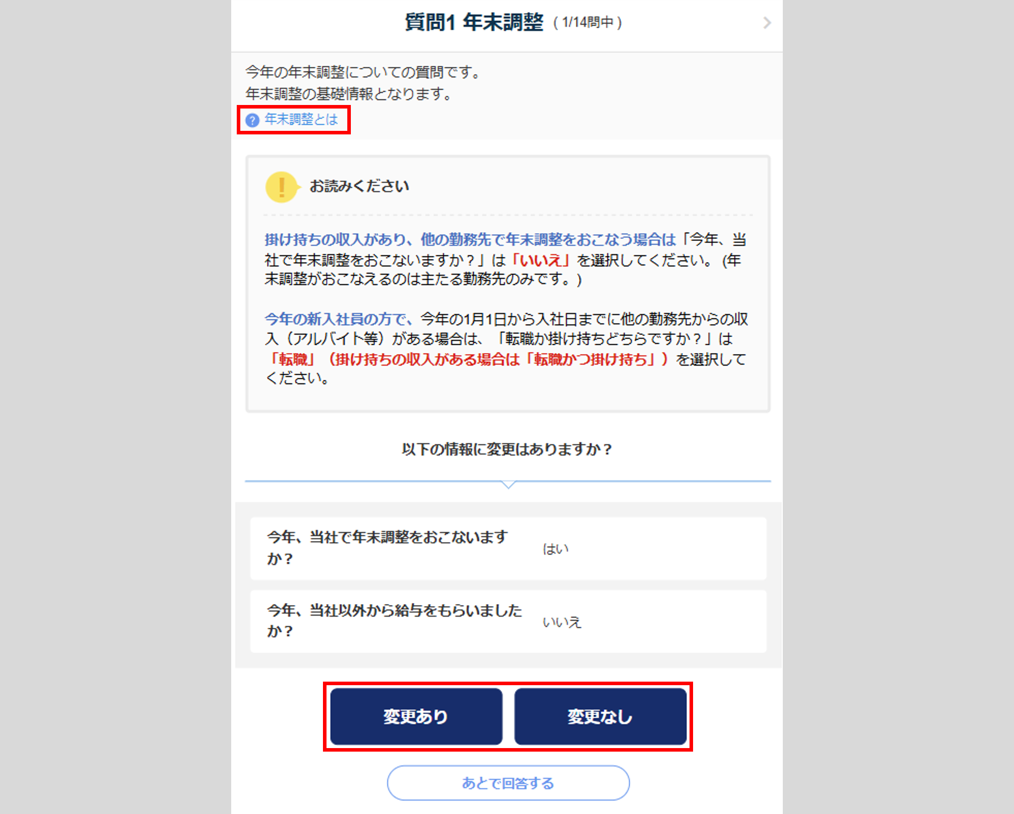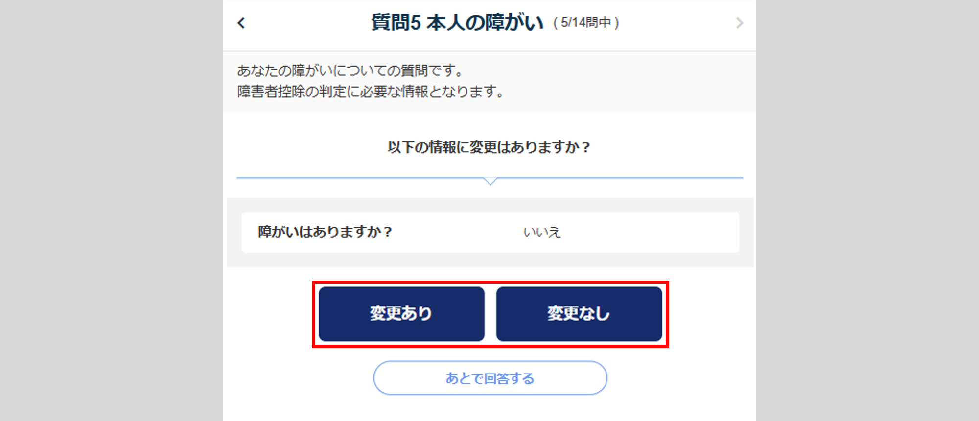 各質問の回答時、[変更なし]をクリック、または[変更あり]>[保存して次へ]をクリックすると、質問の回答を保存します。