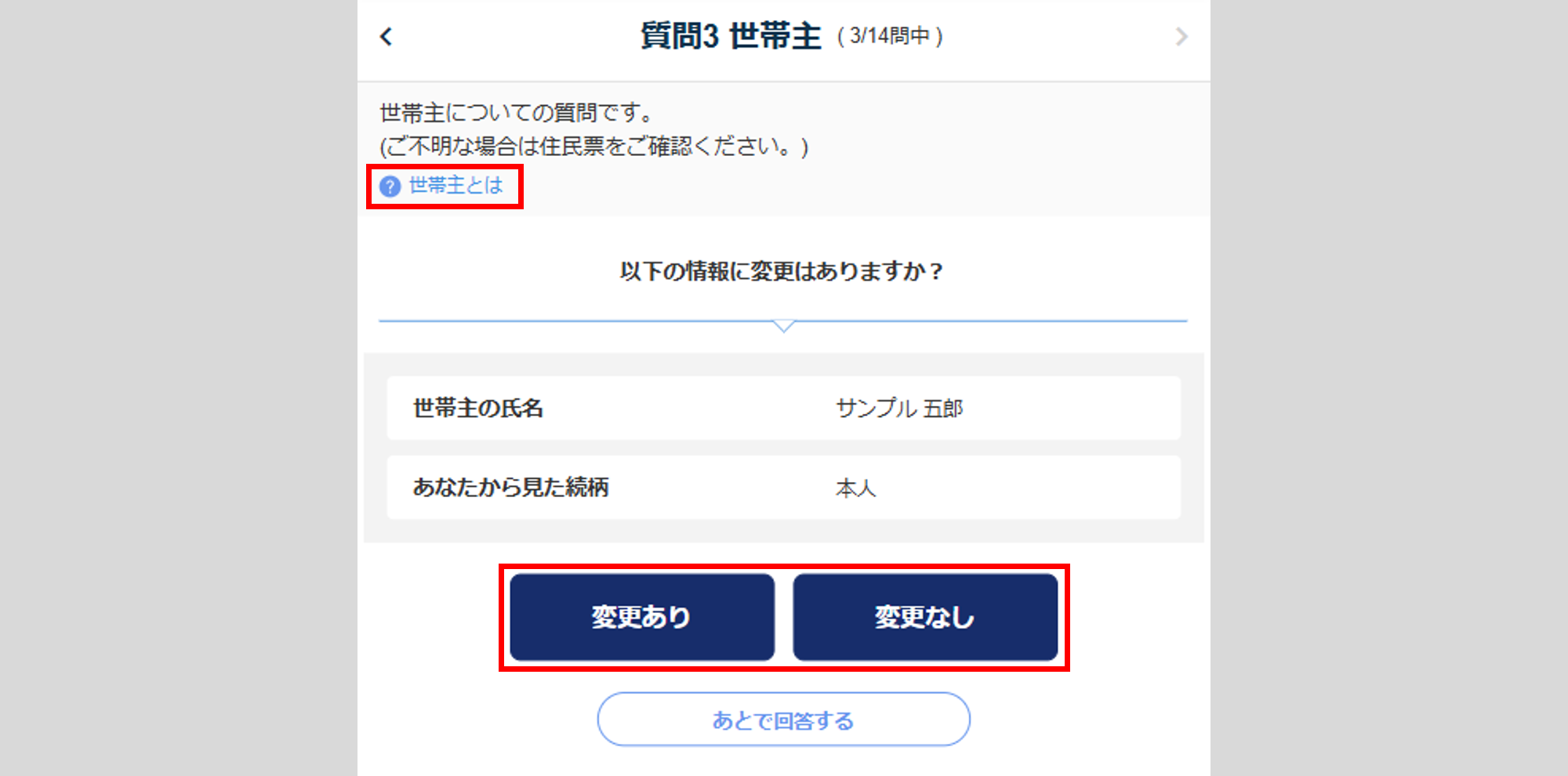 変更がない場合は 、[変更なし]をクリックし、「質問3 世帯主」へ進みます。