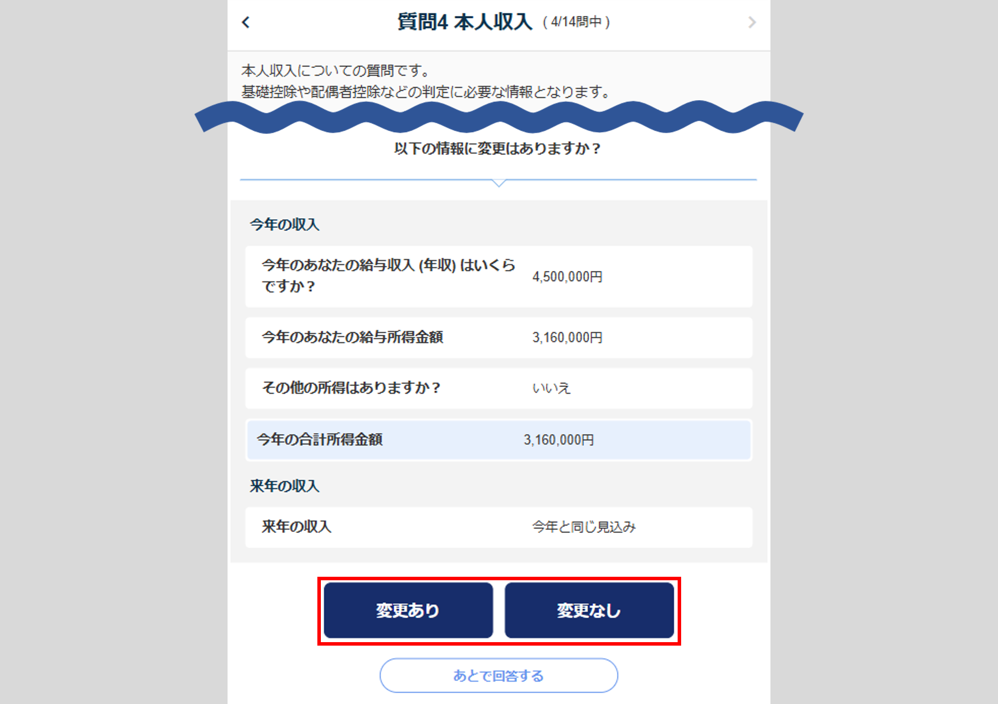 変更がない場合は、[変更なし]をクリックし、「質問4 本人収入」へ進みます。