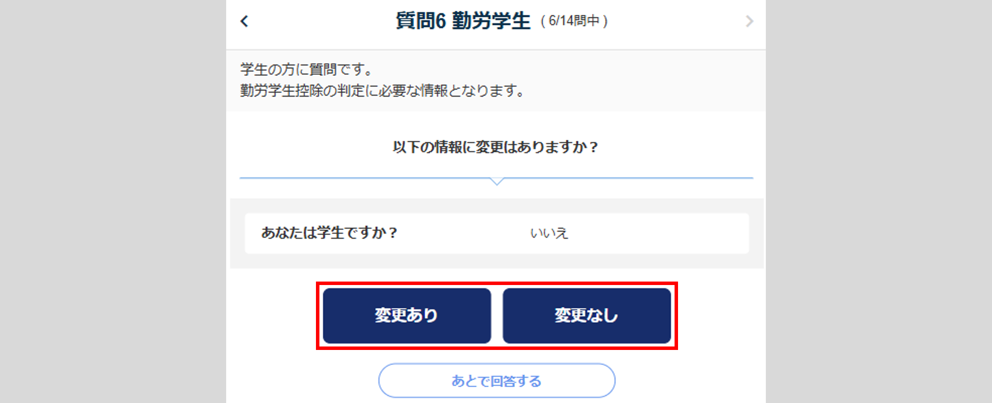変更がない場合は、[変更なし]をクリックし、「質問6 勤労学生」もしくは「質問7 配偶者」へ進みます。