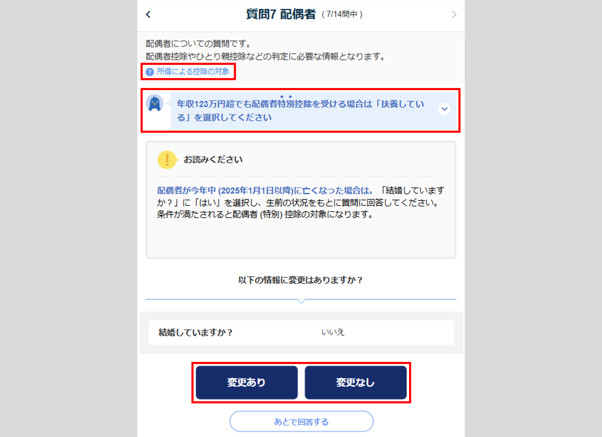 変更がない場合は、[変更なし]をクリックし、「質問7 配偶者」へ進みます。