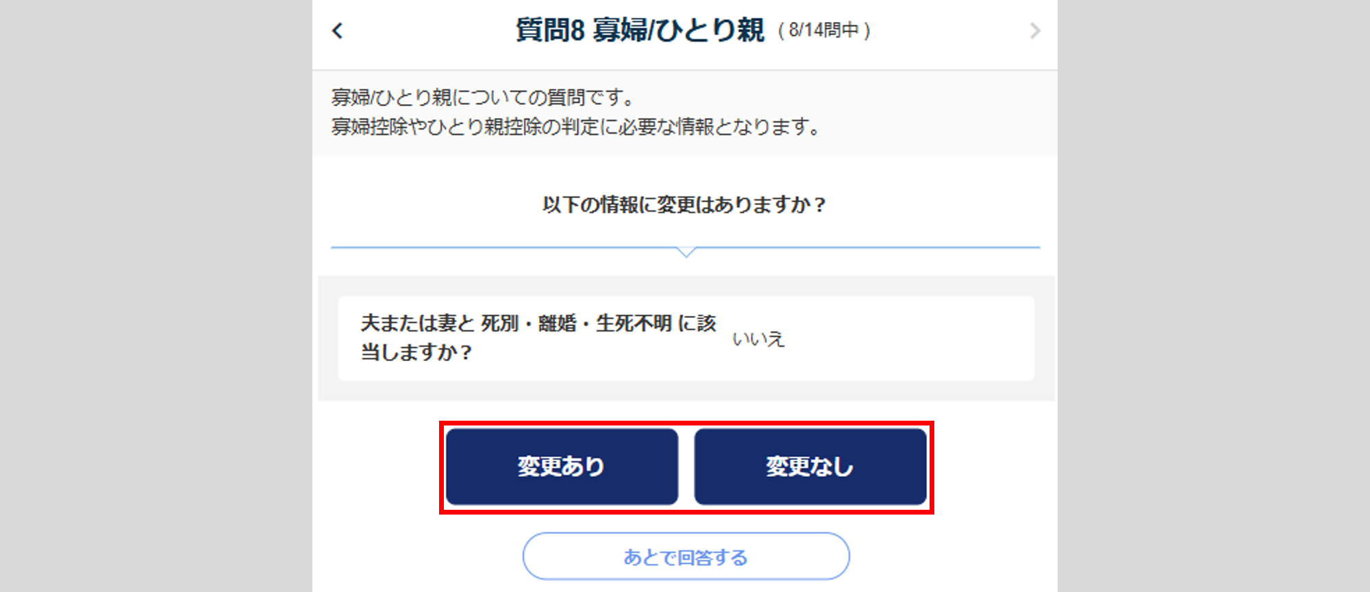 変更がない場合は、[変更なし]をクリックし、「質問8 寡婦/ひとり親」もしくは「質問9 扶養家族」へ進みます。