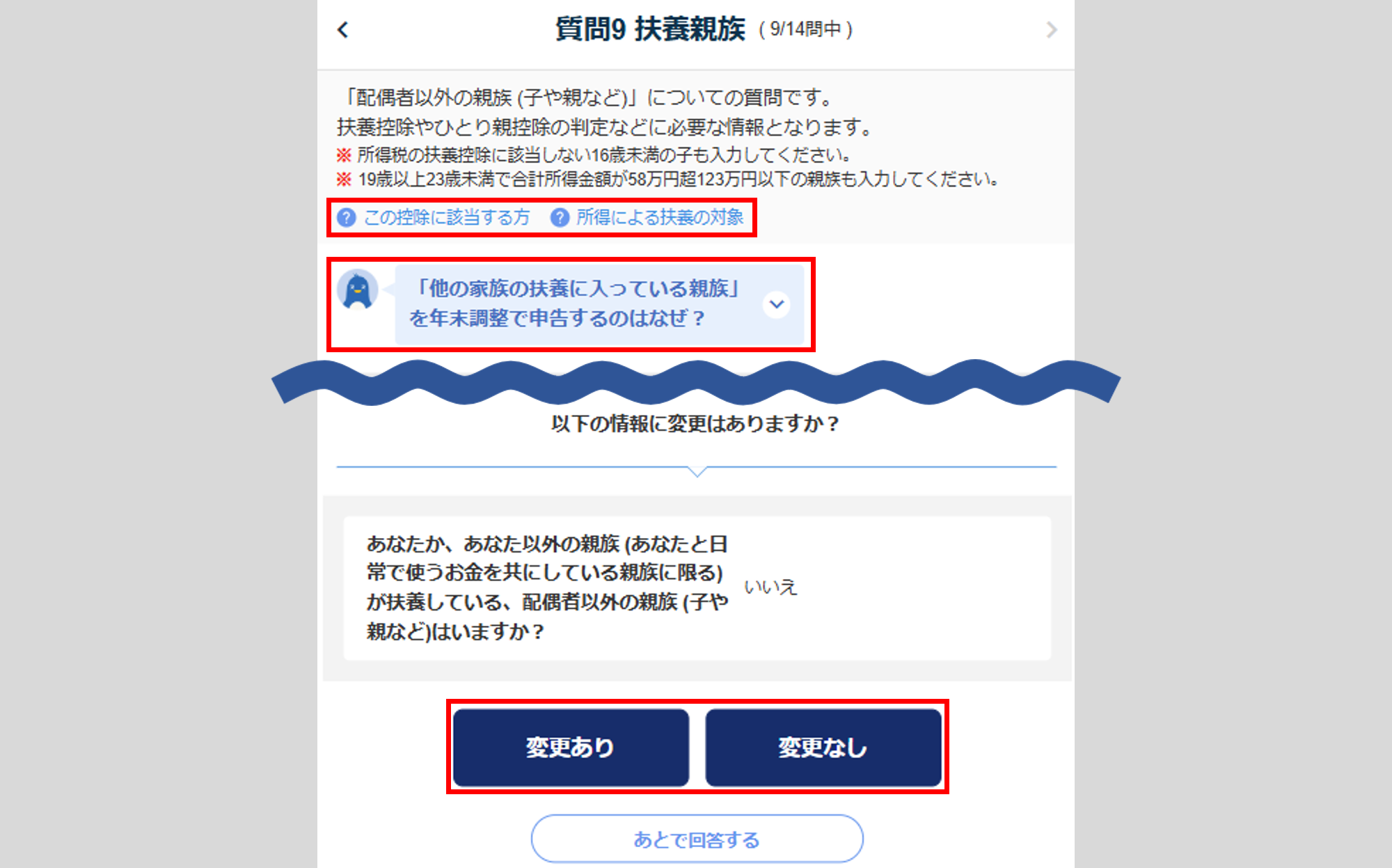 変更がない場合は、[変更なし]をクリックし、「質問9 扶養家族」へ進みます。