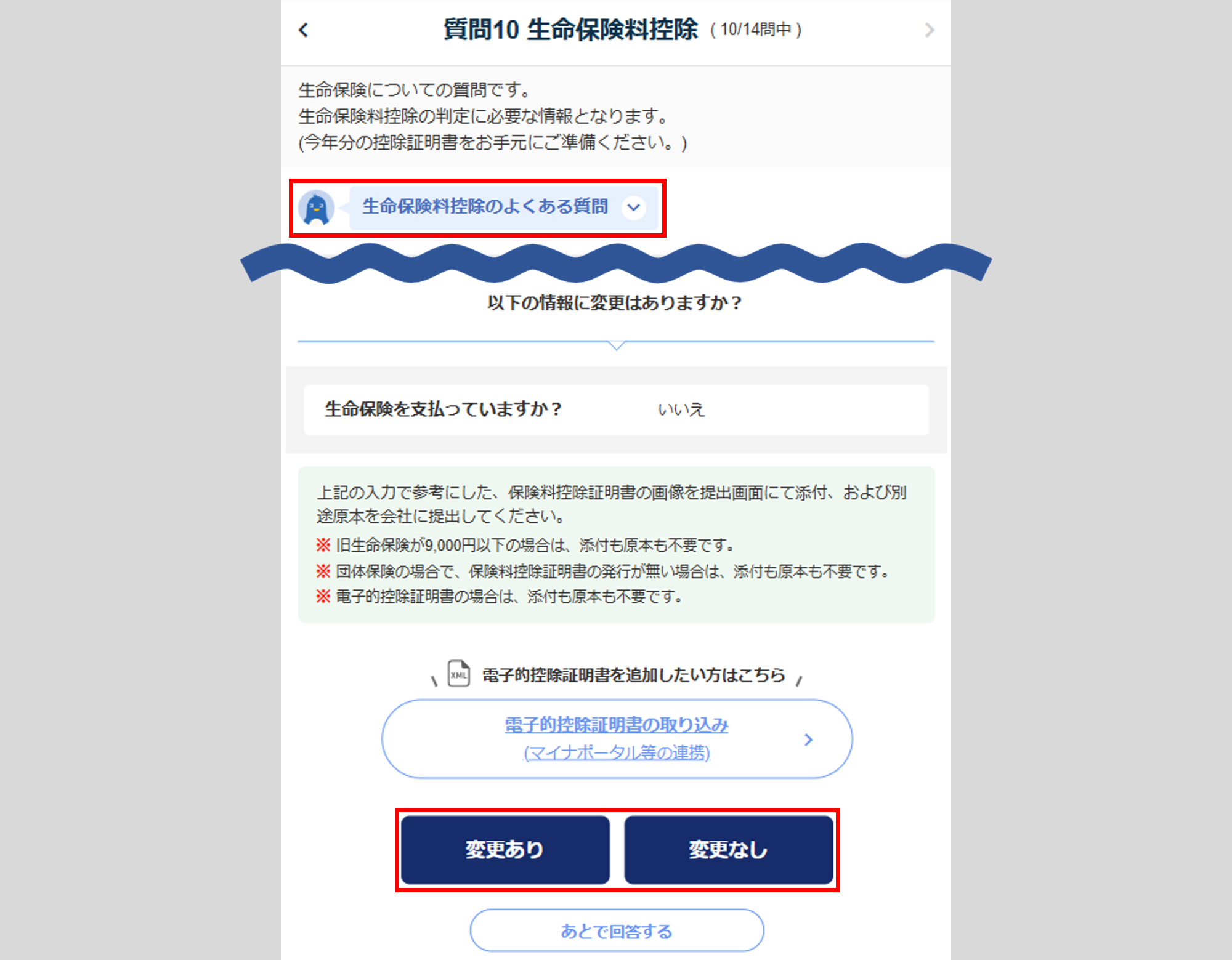 ※電子的控除証明書の取り込みについては、質問10~14の画面にも表示されます。