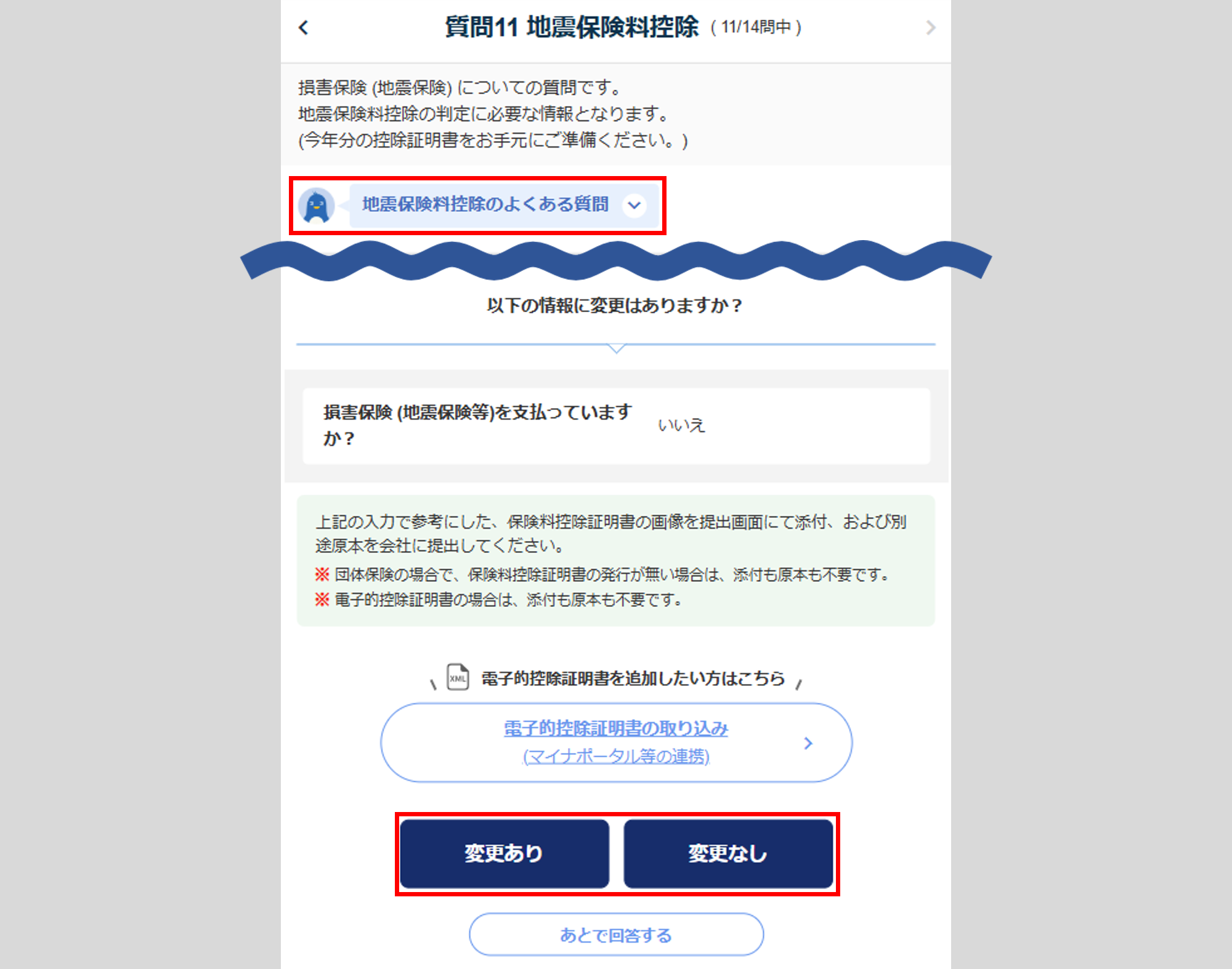 変更がない場合は、[変更なし]をクリックし、「質問11 地震保険料控除」へ進みます。