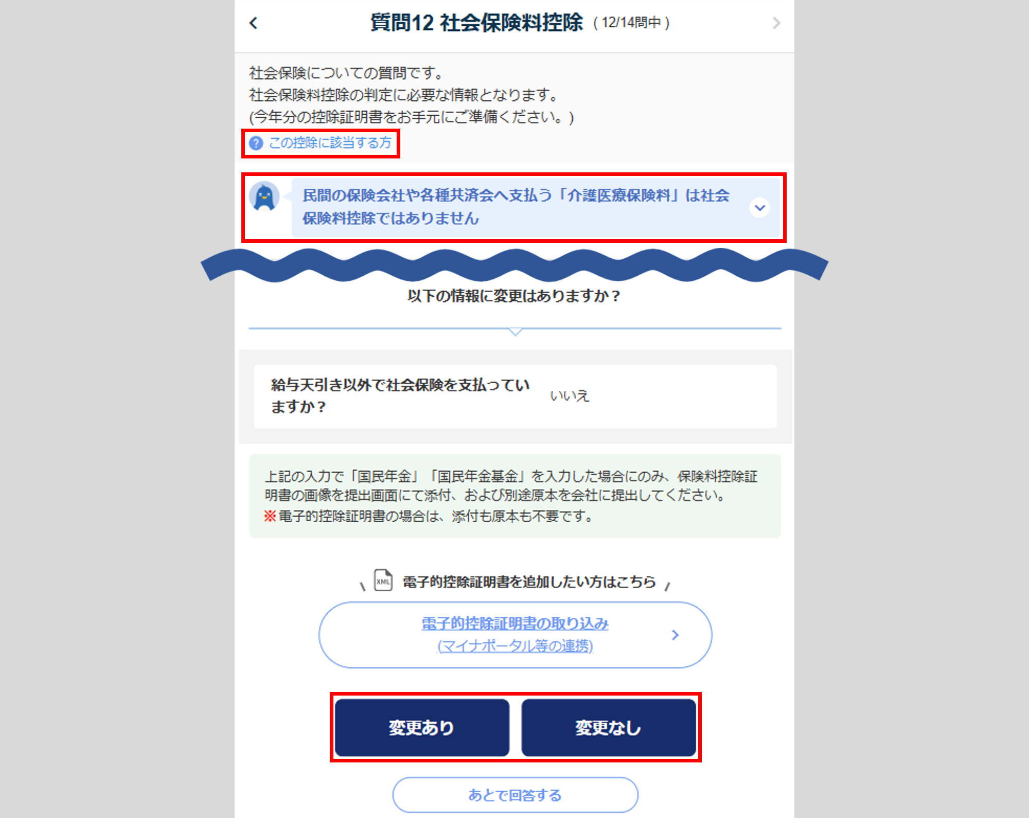 変更がない場合は、[変更なし]をクリックし、「質問12 社会保険料控除」へ進みます。