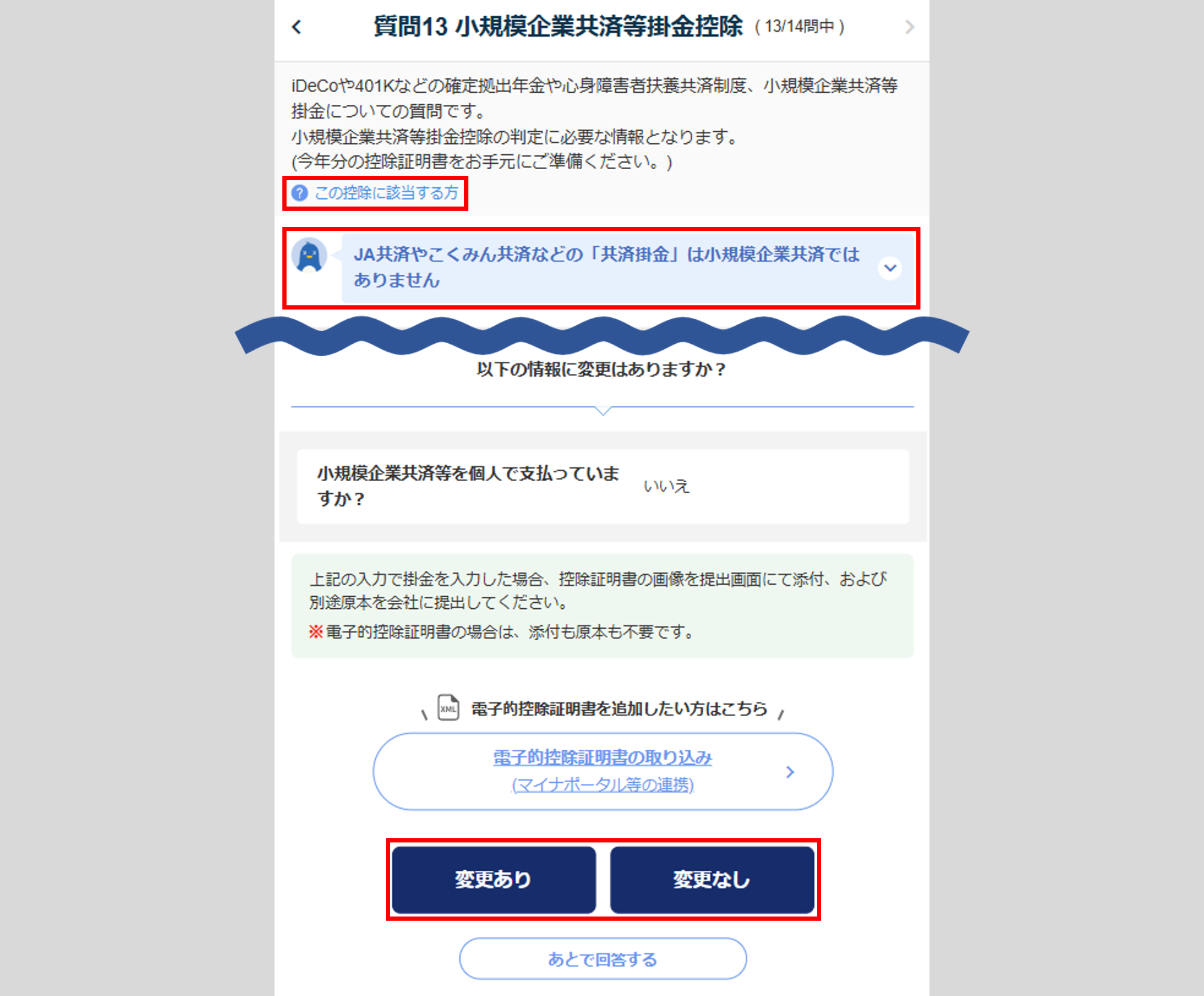 変更がない場合は、[変更なし]をクリックし、「質問13 小規模企業共済等掛金控除」へ進みます。