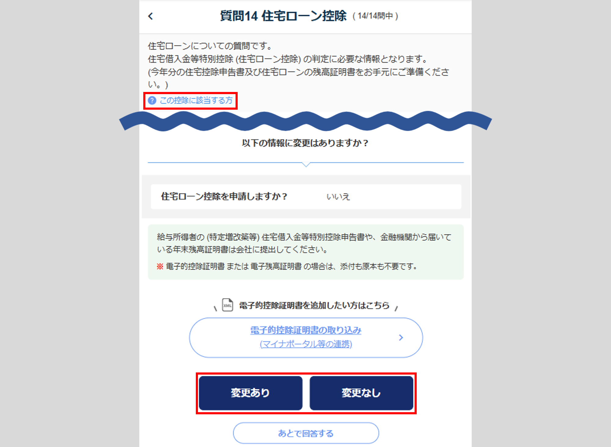変更がない場合は、[変更なし]をクリックし、「質問14 住宅ローン控除」へ進みます。)