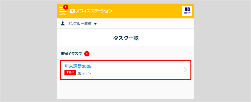 オフィスステーションへログインし、タスク一覧に表示されている[年末調整2025]をクリックします。