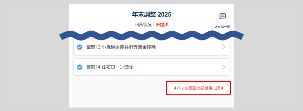 「年末調整TOP」画面下部の[すべての回答を初期値に戻す]をクリックします。