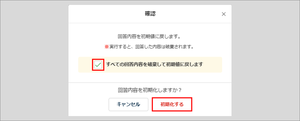 「確認」ウィンドウに表示されている内容を確認後、「すべての回答内容を破棄して初期値に戻します」にチェックを入れ、[初期化する]をクリックします。