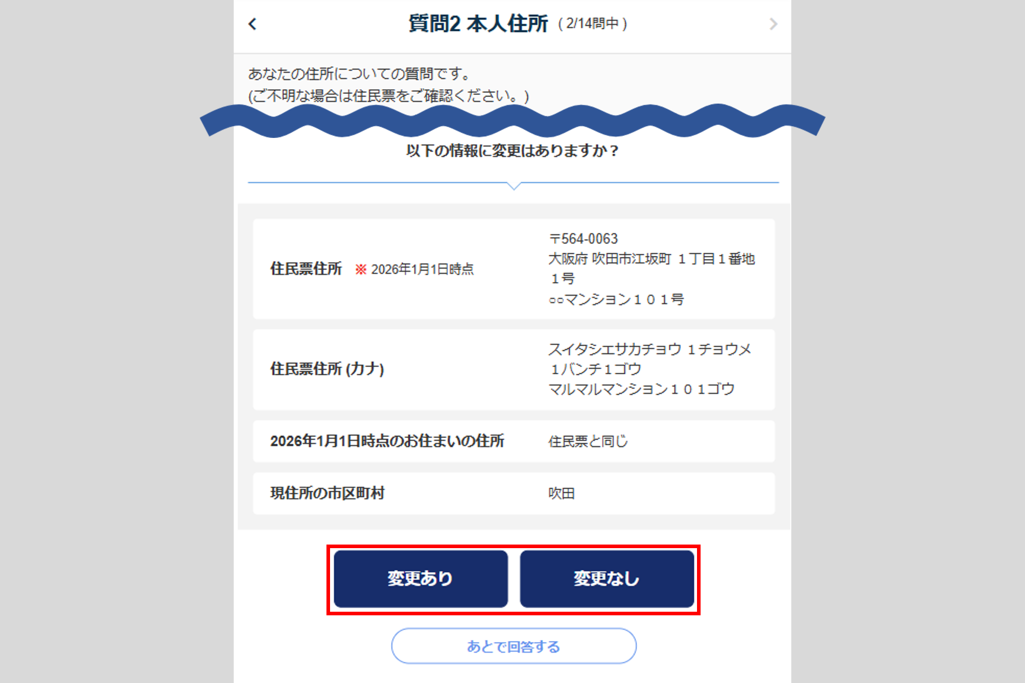 変更がない場合は、[変更なし]をクリックし、「質問2 本人住所」へ進みます。