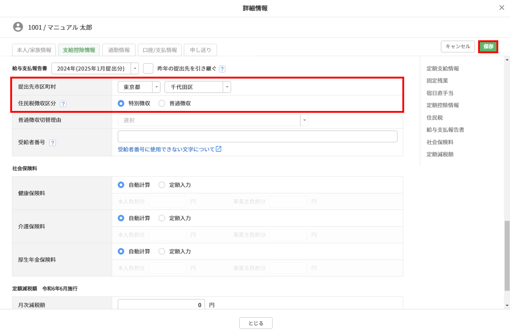 「提出先市区町村」をプルダウンから選択し、「住民税徴収区分」を選択後、[保存]をクリックします。