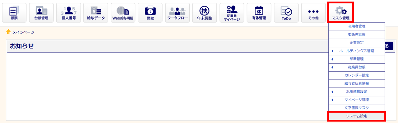 [マスタ管理]>[システム設定]をクリックします。
