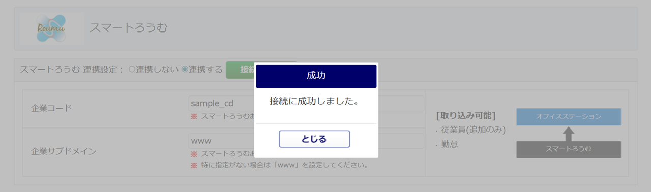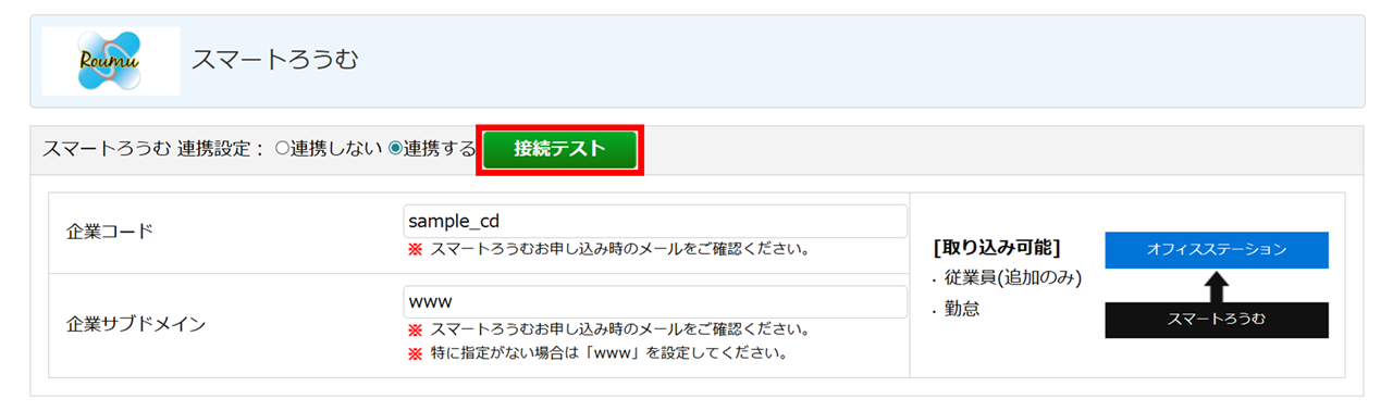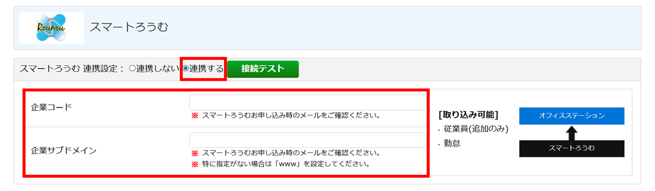 「スマートろうむ」欄の「スマートろうむ連携設定:連携する」を選択し、「企業コード」「企業サブドメイン」を入力します。