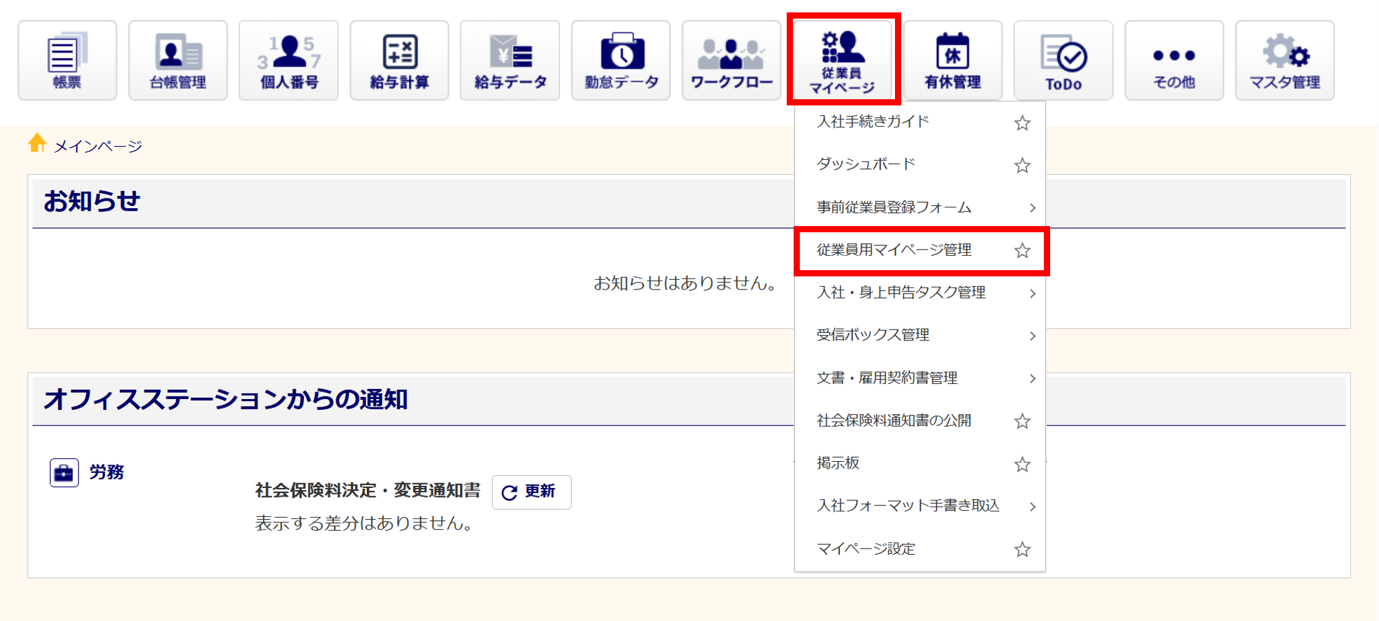 [従業員マイページ]>[従業員用マイページ管理]をクリックします。