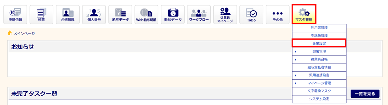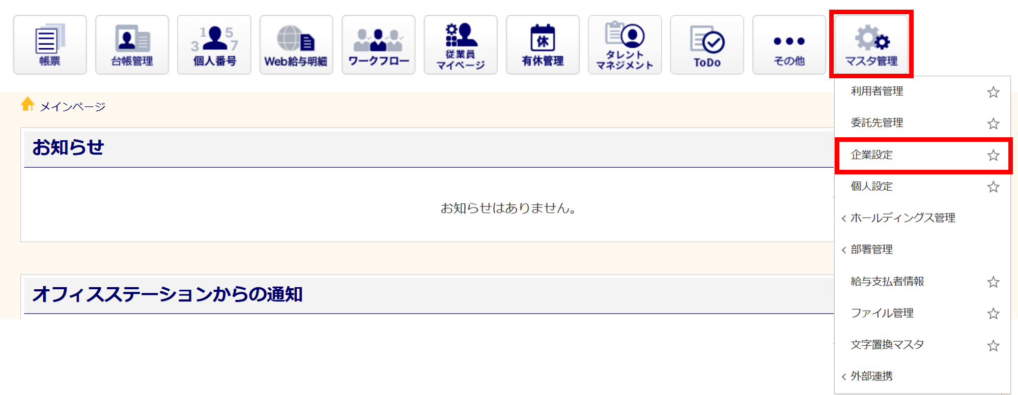 [企業設定]もしくは[事務所設定]は、管理者権限の場合のみ表示されます。