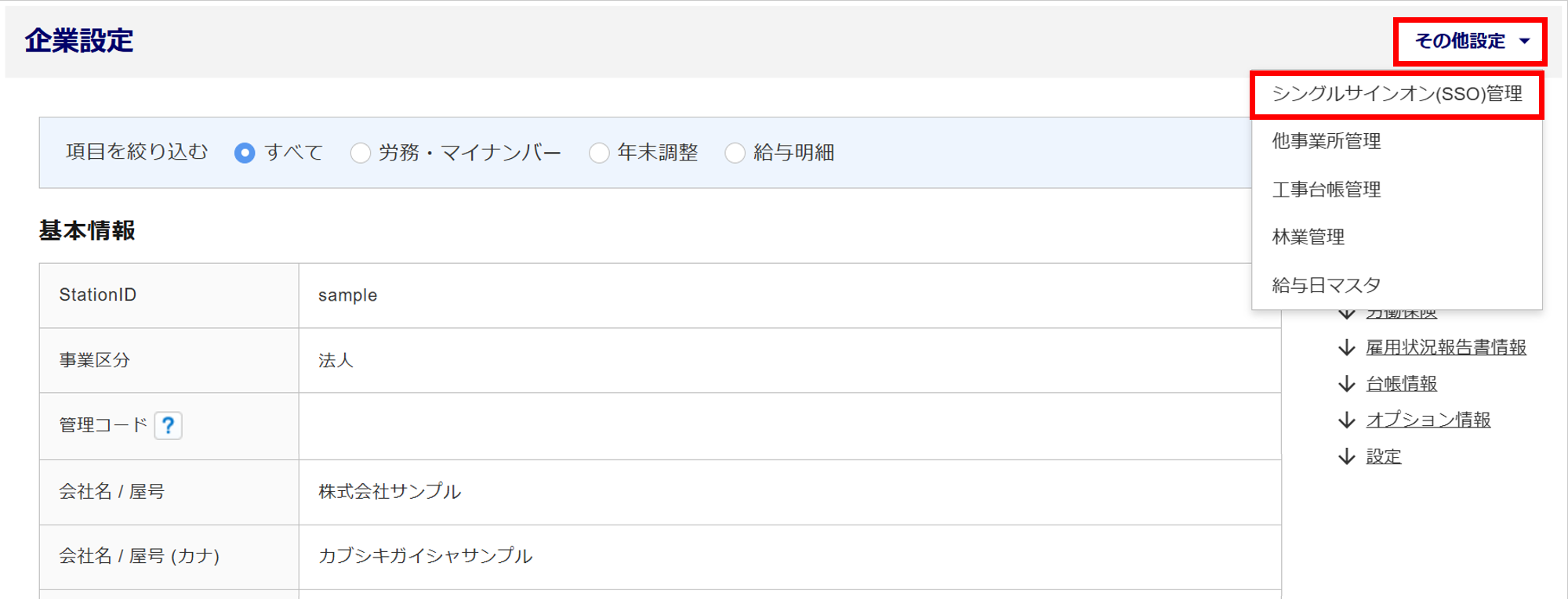 [その他設定]>[シングルサインオン(SSO)管理]をクリックします。