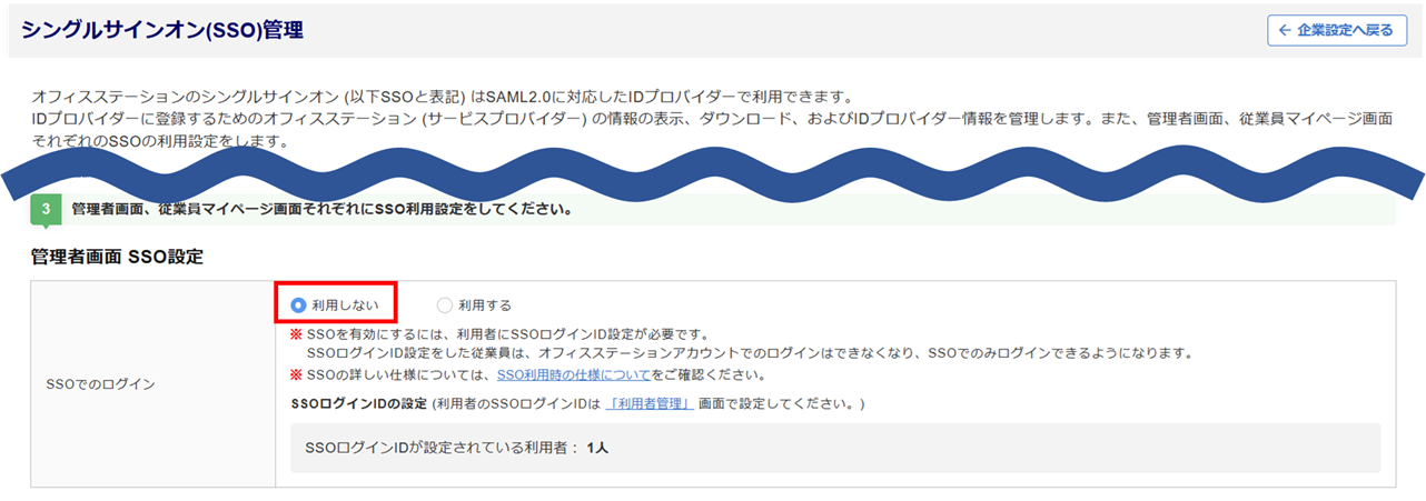 SSO利用設定を無効に変更すると、SSOでのログインを設定しているすべての利用者、従業員が通常のログインに変更となり、SSOでのログインはできなくなります。