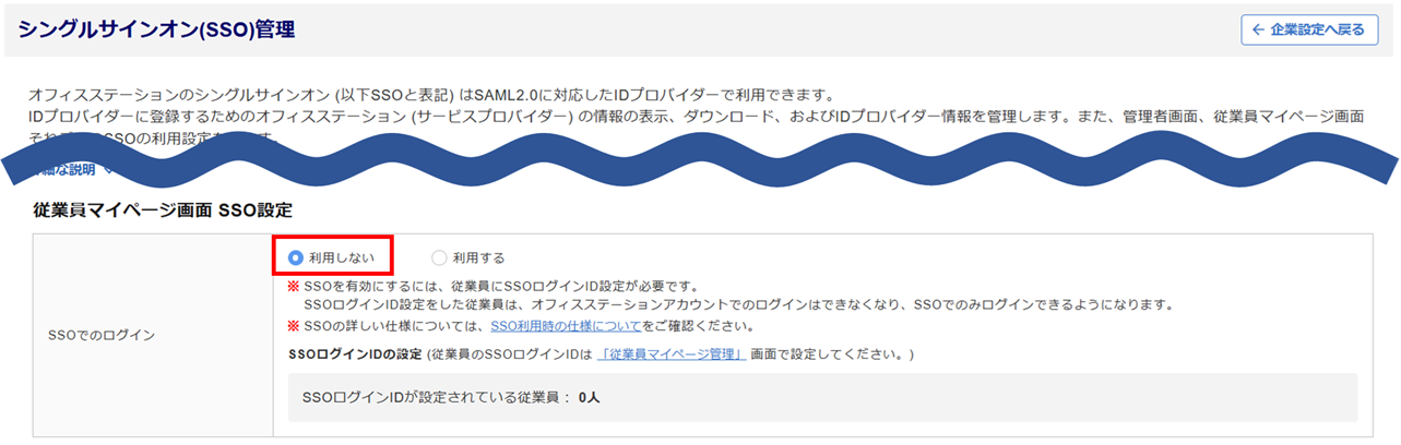 「従業員マイページ画面 SSO設定」カテゴリの「SSOでのログイン」項目にて「利用しない」を選択します。