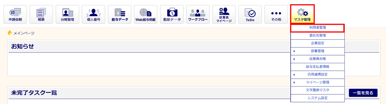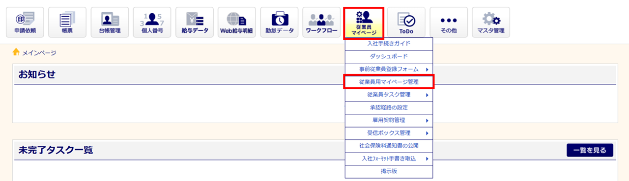 管理者権限の利用者にてログイン後、[従業員マイページ]>[従業員用マイページ管理]をクリックします。