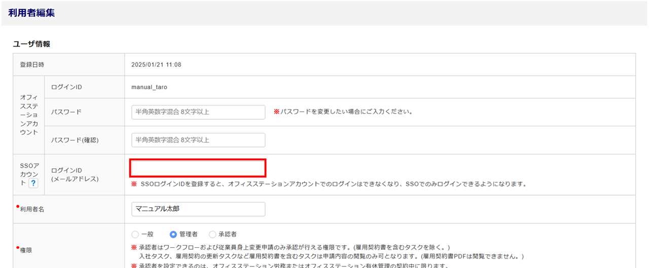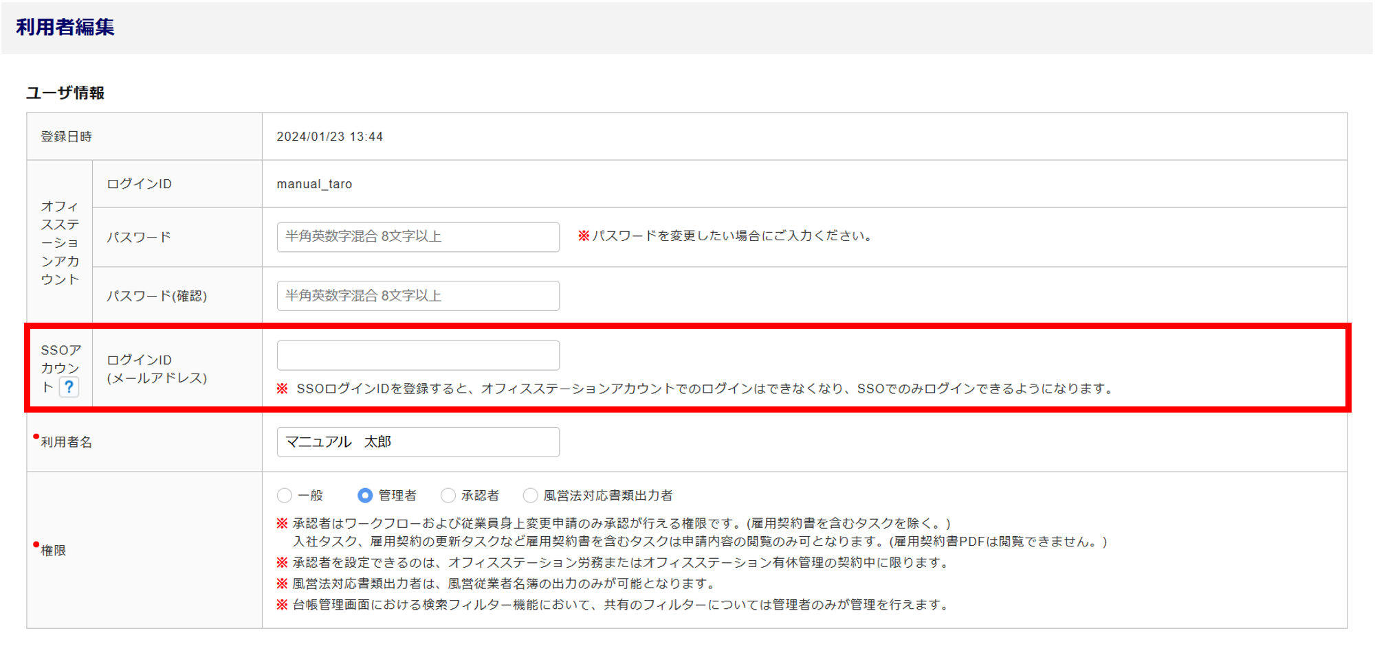 「SSOログインID(メールアドレス)」を削除し、[登録]をクリックします。