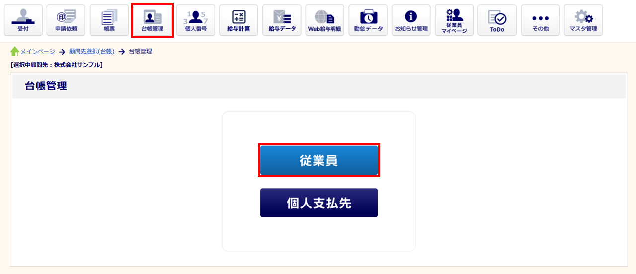 [台帳管理]> 対象の顧問先を選択 >[従業員]をクリックします。