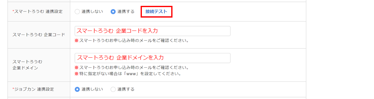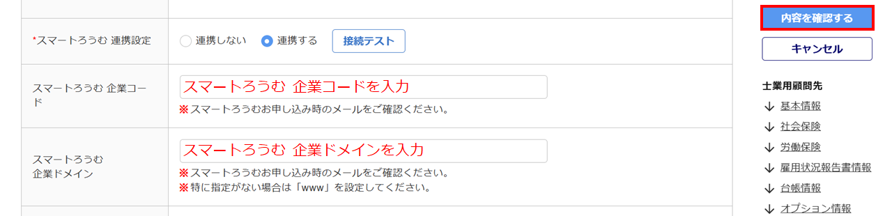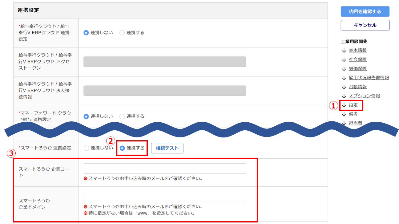 「スマートろうむ 連携設定」を「連携する」(②)に設定し、「スマートろうむ 企業コード」「スマートろうむ 企業ドメイン」(③)を入力します。