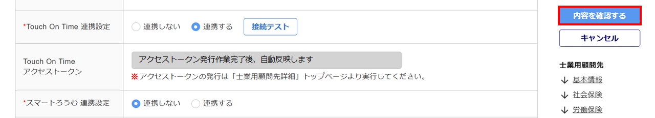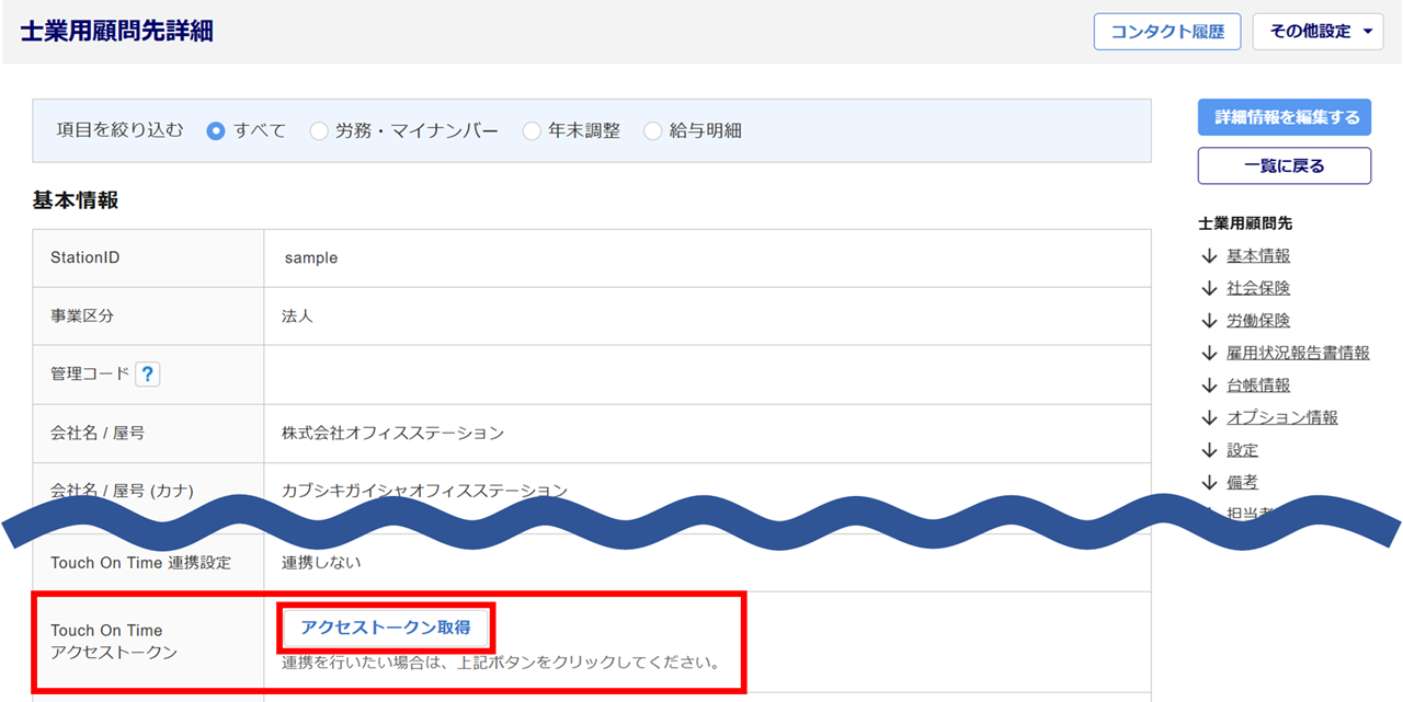 「士業用顧問先詳細」画面にて、「Touch On Time アクセストークン」欄の[アクセストークン取得]をクリックします。
