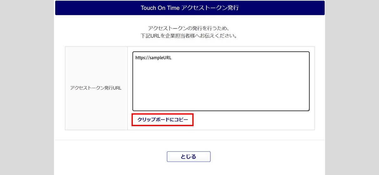 [クリップボードにコピー]をクリックし、アクセストークン発行URLを顧問先企業の担当者へお伝えください。
