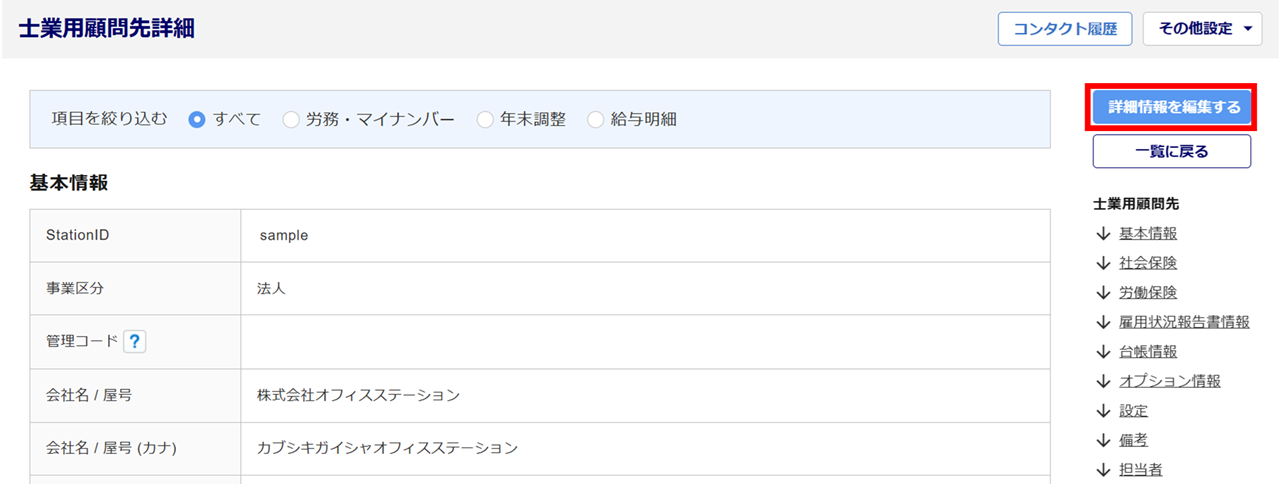 顧問先企業の担当者での操作が完了後、「士業用顧問先詳細」画面右側にある[詳細情報を編集する]をクリックします。
