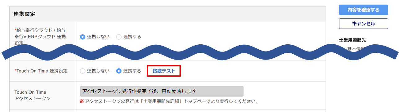 「Touch On Time 連携設定」欄の[接続テスト]をクリックし、接続に問題がないか確認します。
