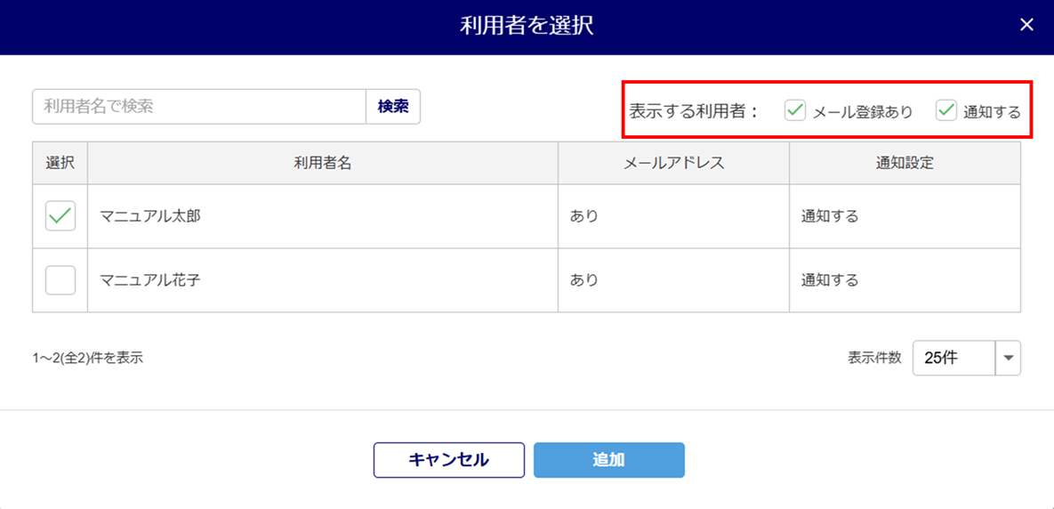 「表示する利用者」にチェックを入れると、絞り込んで表示できます。