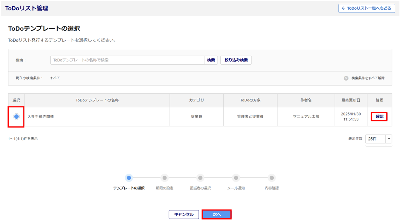 ToDoリスト発行するテンプレートを選択後、[次へ]をクリックします。