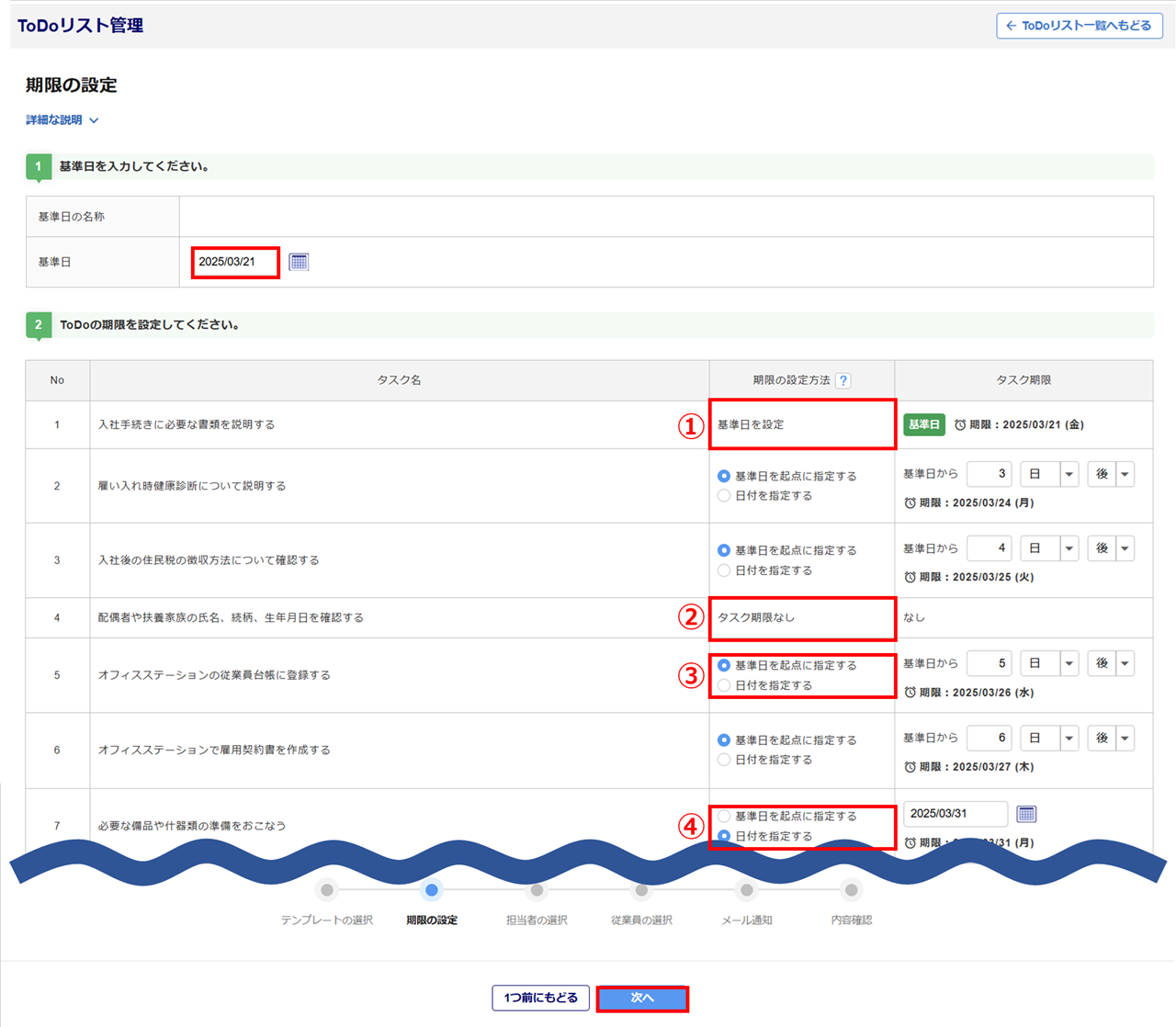 | 番号 | 期限の設定方法 | タスク期限 |