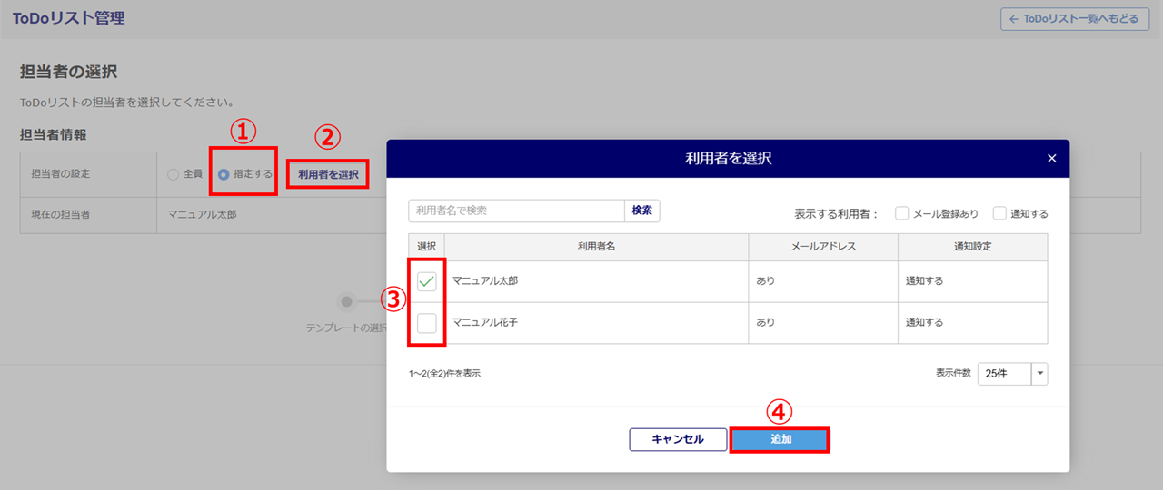 「指定する」(①)を選択し、[利用者を選択](②)>対象の利用者の「選択」列(③)にチェック>[追加](④)をクリックします。