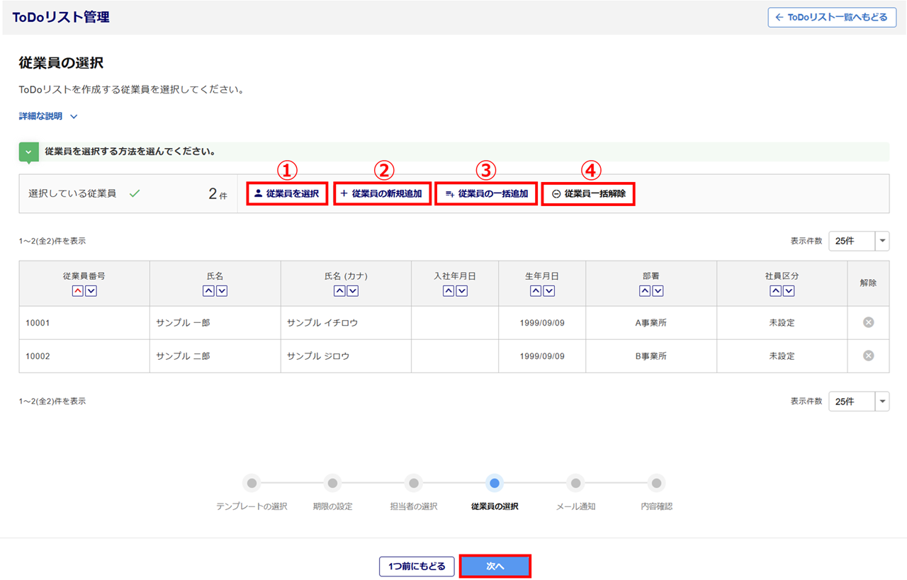 「台帳管理」に登録済みの従業員を選択します。一度に複数の従業員を選択することも可能です。