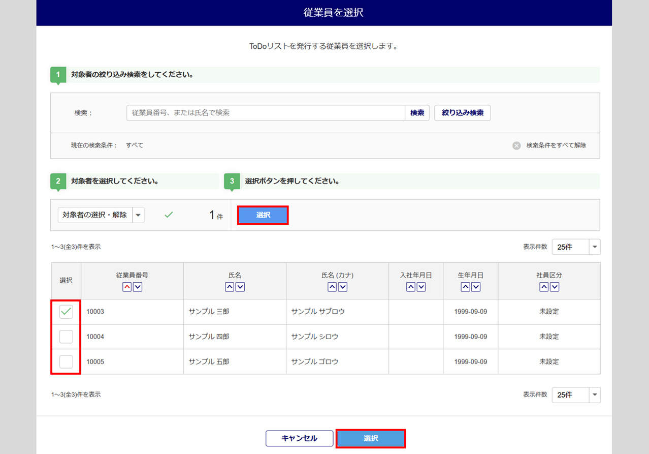「従業員を選択」画面にて、対象従業員の「選択」列にチェックし、[選択]をクリックします。