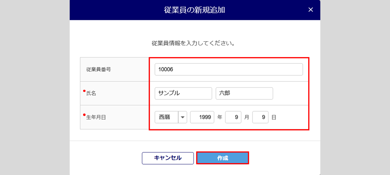 「従業員番号」「氏名」「生年月日」を入力後、[作成]をクリックします。